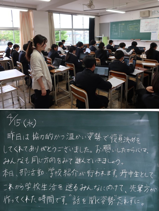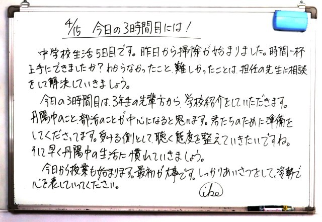 今日は、3年生の先輩たちから丹陽中学校の魅力を教えてもらう会が予定されています。2年前にはみなさんと同じようにドキドキしながら入学した先輩たちです。中学校の生活を通して成長した姿を見せてくれます。楽しみにしていてくださいね。
