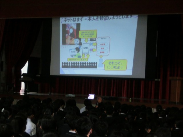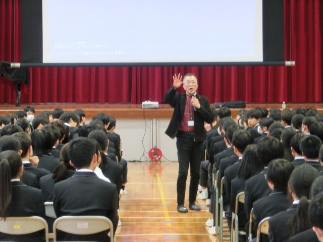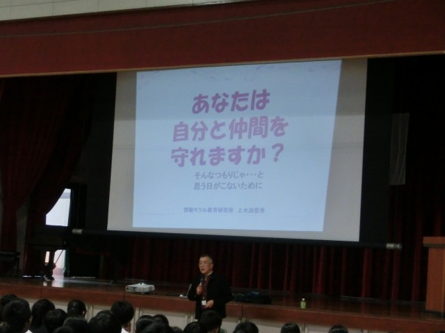 本日の午後、情報モラル教室が行われました。講師として、情報モラル教育研究所の上水流信秀様にお越しいただき、インターネットやSNS、AIの使い方についてお話をいただきました。生徒は、自分たちの身近なところにあるリスクについて真剣に考えたり、生成AIの長所・短所についてメモをとりながら聞いたりしていました。今日学んだことを生かしながら、今後も上手にインターネット等を活用していってほしいと思います。