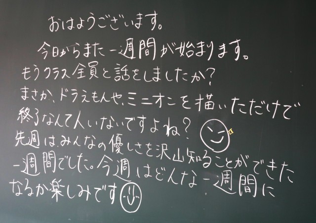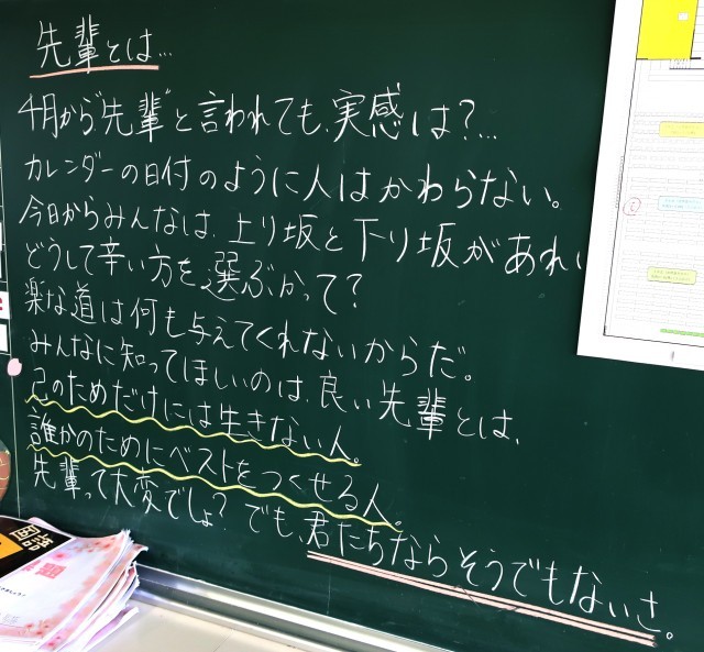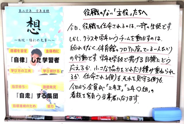 新しい学級組織や学年組織が本格的に動き出しています。一人一人が目標をもって行動することで、学年や学級全体のパワーアップにつながっていきます。一人一人が大切な存在です。そのことを全員が意識して行動できる集団であり続けましょう。