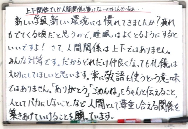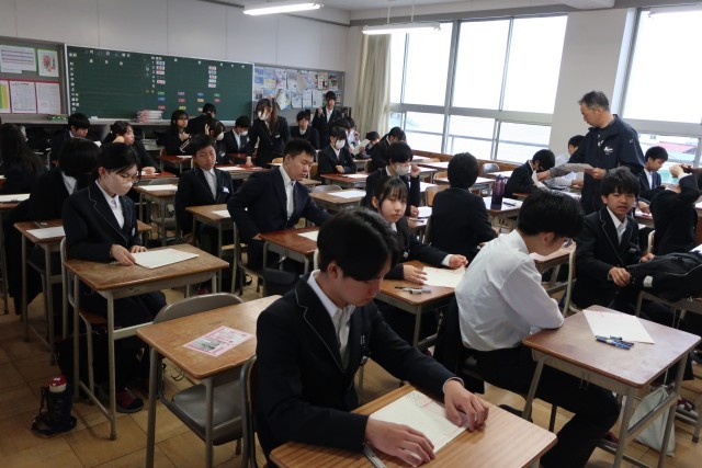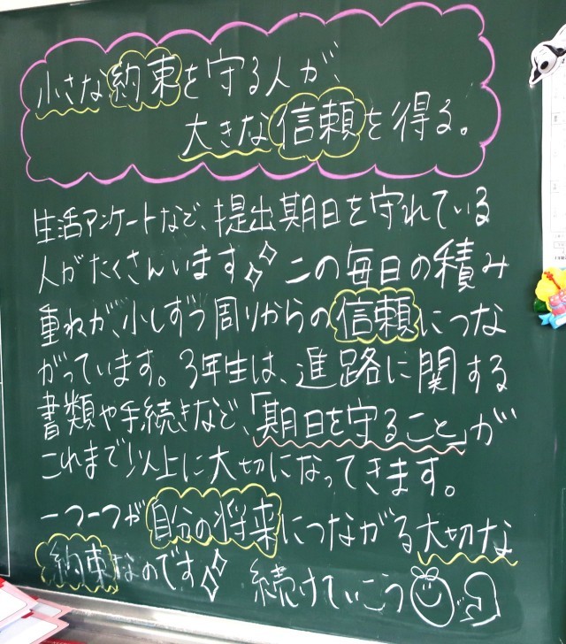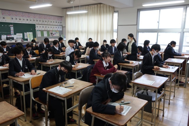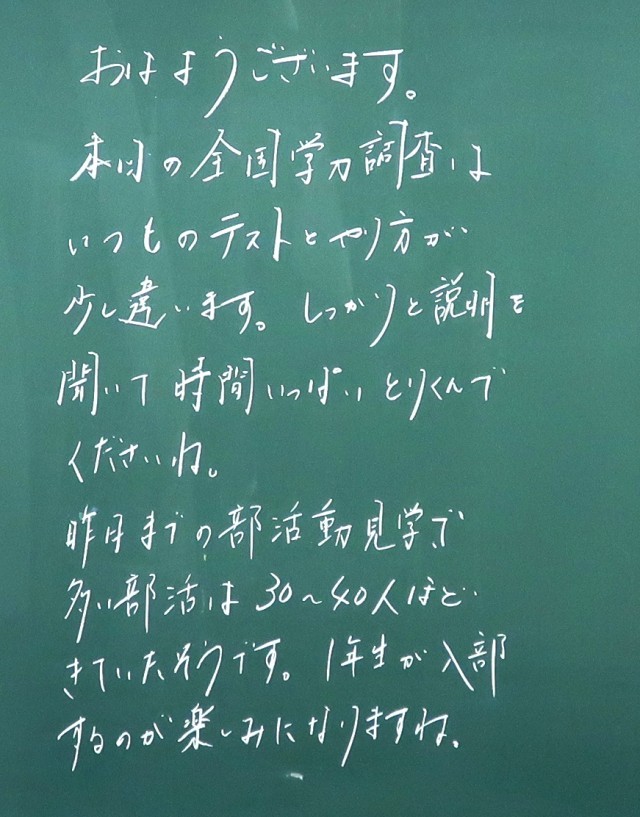 今日の全国学力学習状況調査は、いつもの定期テストやiテストと少し雰囲気が違います。数か月後に多くの人が挑戦する入試も、いろいろなパターンの受験の方法がありますので、よい練習になりますね。落ち着いて取り組んでくださいね。