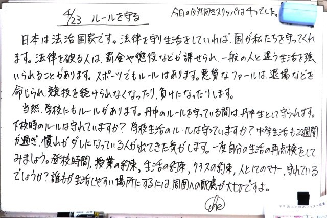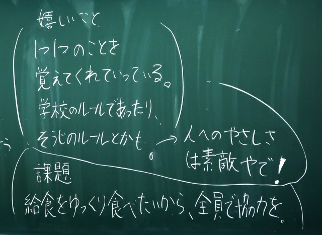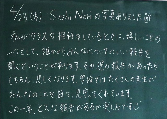 入学してから、まだ3週間ほどですが、1年生のみなさんは集団生活で大切なことをどんどん吸収して実行することができるようになってきていますね。先生たちもみなさんの成長を頼もしく感じています。教科の授業も積極的に取り組めていますね。この調子てがんばって行きましょう。