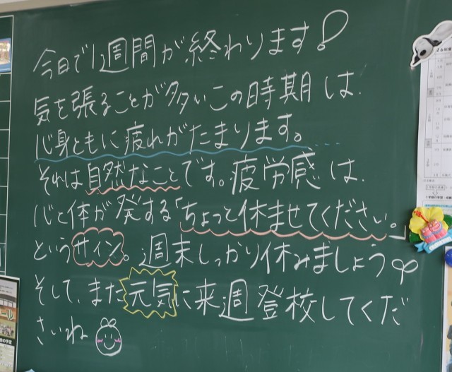 今週一週間、よくがんばりましたね。週末に体をしっかりやすめてください。来週もみなさんのがんばる姿をたくさん見せてください。楽しみにしています。