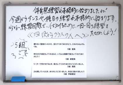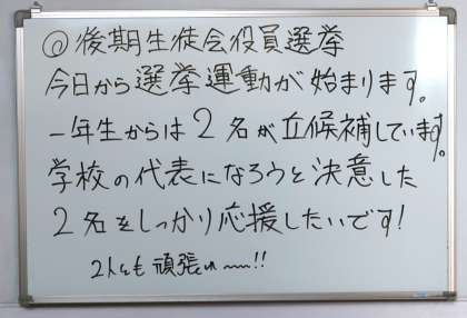 9月12日(月)先生からのメッセージ 公開日 2022/09/12 更新日 2022/09/12 今日のワンショット 後期生徒会役員選挙の選挙運動が始まりました。生徒のみなさんも、生徒会の一員として、丹陽中学校をよりよくしていくための方法を考えてみてください。みんなで協力してがんばりましょう。