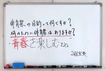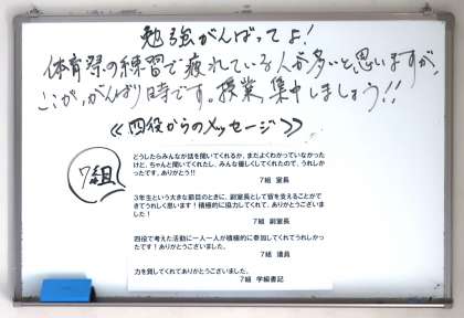 9月13日(火)先生からのメッセージ 公開日 2022/09/13 更新日 2022/09/13 今日のワンショット 体育祭の練習はもちろんですが、学習や生活面も充実させていきましょう。後期の生活を充実させるために、前期の振り返りもいきましょう。