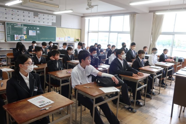 朝のあいさつの後、先生のお話を聞いたり、テストの準備をしたりしています。今日の午後は、講演会が予定されています。担任の先生から講師の先生の紹介もあったようです。