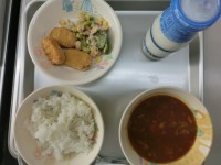 今日の献立はご飯牛乳ポークカレーチキンナゲットまめまめサラダ今日のまめまめサラダ...