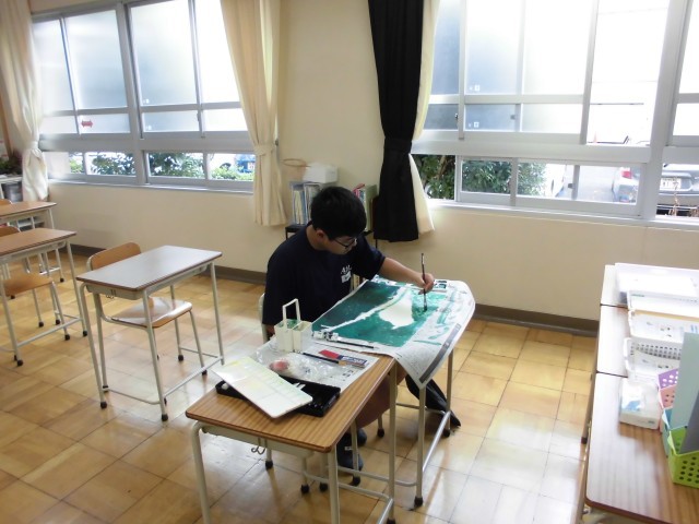 1枚目は特別支援学級「美術」の様子です。水彩画の制作をしています。今日は、背景を丁寧に塗っていました。素敵な作品が完成するといいですね。