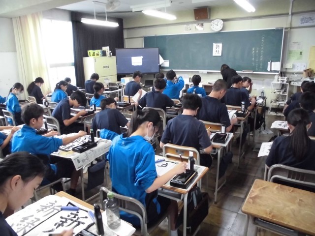 3枚目は2年生「国語」の様子です。書写(毛筆)の学習をしています。点や画のつながりを意識しながら、集中して取り組んでいました。