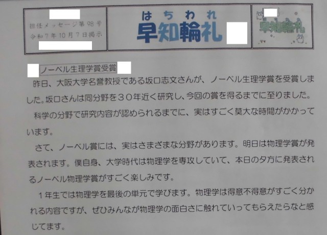 ノーベル賞についてのメッセージもありました。どんな人が、どんな研究、作品、取り組みで受賞したのか?調べてみてはいかがでしょうか?