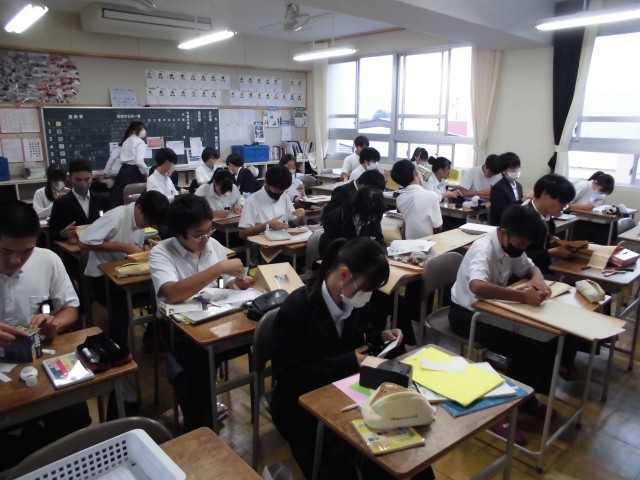 1枚目は1年生「社会」の様子です。国風文化について学習しています。外国との関係を踏まえて、国風文化の特徴を考えていました。「漢字を覚えるのがたいへん」という声が上がっていました。授業に集中して取り組み、課題等を利用して復習することで、身に付けていきたいですね。