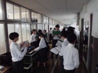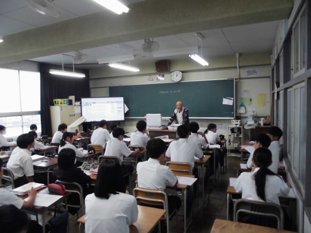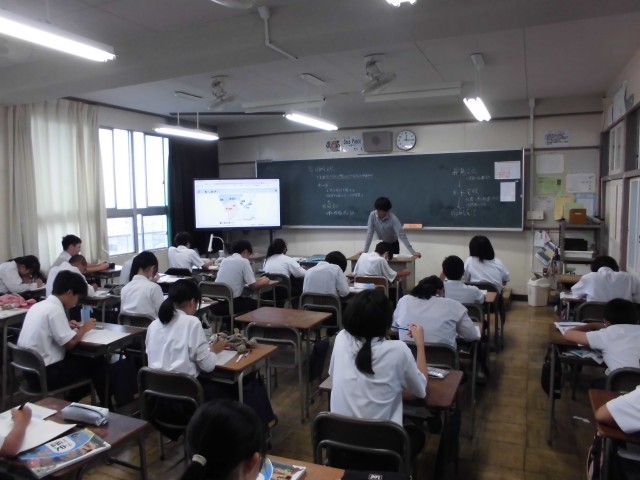 2枚目は2年生「英語」の様子です。好きなスポーツについての学習をしています。先生が「有名なテニスプレーヤは?」の問いかけに、様々な答えが返ってきました。松岡修造、吉田沙保里(?)・・・このクラスではテニスの認知度はあまり高くないようです。自然に意見が出るクラスの雰囲気が素敵でした。