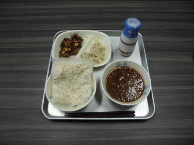 ソフトめん 牛乳 ソフトめんのミートソース さつまいもと大豆の甘がらめ れんこんサラダ