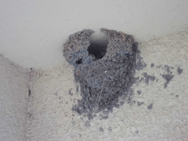 今日の朝、つばめの巣を見ると、入口が壊れていました。ようやく巣立ちをしたようです。