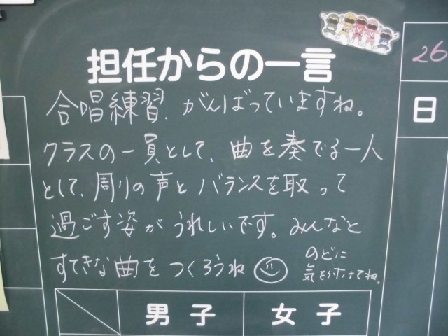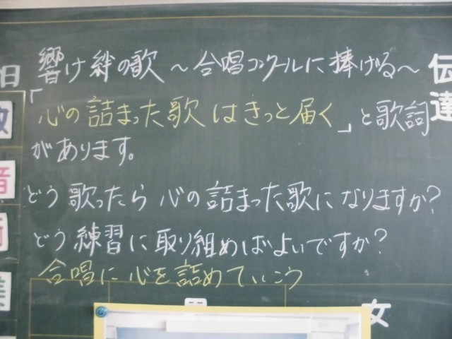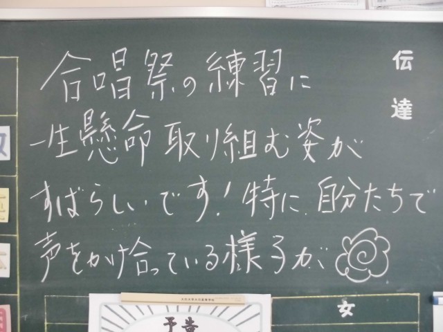 今日も合唱練習があります。みんなで力を合わせて、「心の詰まった歌」を創り上げていきましょう。