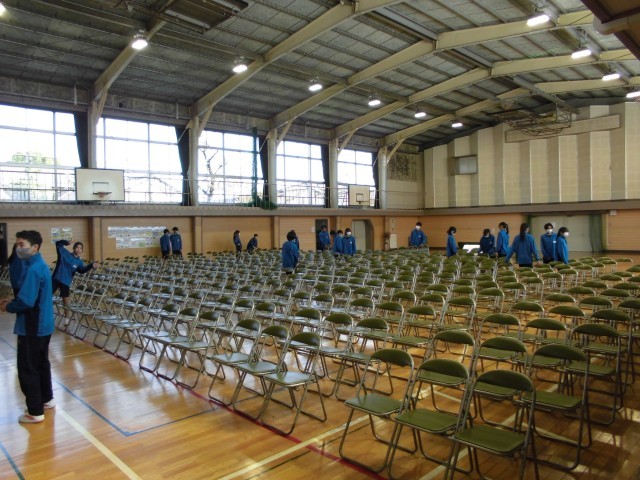 今日の6時間目に3年生と保護者の方を対象に進路説明会を行います。体育館を見ると、3年生の生徒が会場準備をしていました。