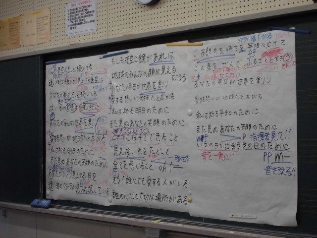 合唱祭の練習で書き込まれた歌詞(1枚目)。