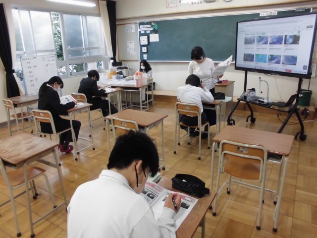 1枚目は特別支援学級「理科」の様子です。気象について学習をしています。雲の様子や動き・天気の移り変わりなど、映像を見ながら、学習プリントにまとめていました。