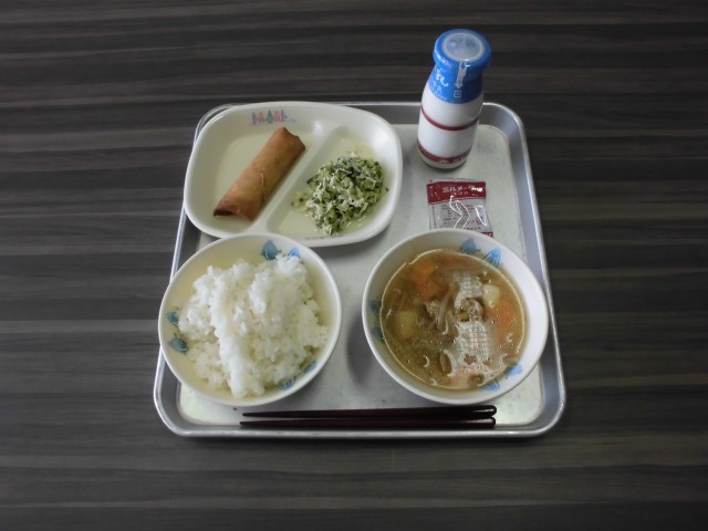 ご飯 牛乳 春巻 バンバンジー 豆腐の中華スープ ココアパウダー