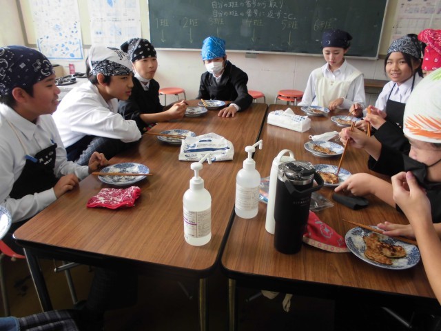 1年生の学級では、今年度初めて家庭科で「豚肉のしょうが焼き」の調理実習がありました。「どうしたらおいしくなるか?」しょうがだれの漬け込み方、肉の色の変化からひっくり返すタイミングを真剣に見て、協議しながらひっくり返しました。「みんなで作ったら楽しかった」「難しかったけど美味しかった」という声も多く、調理の楽しさと大変さを実感でき、給食を食べきることにもつながったようです。