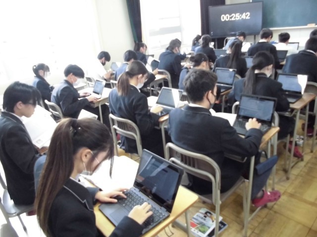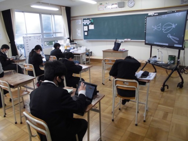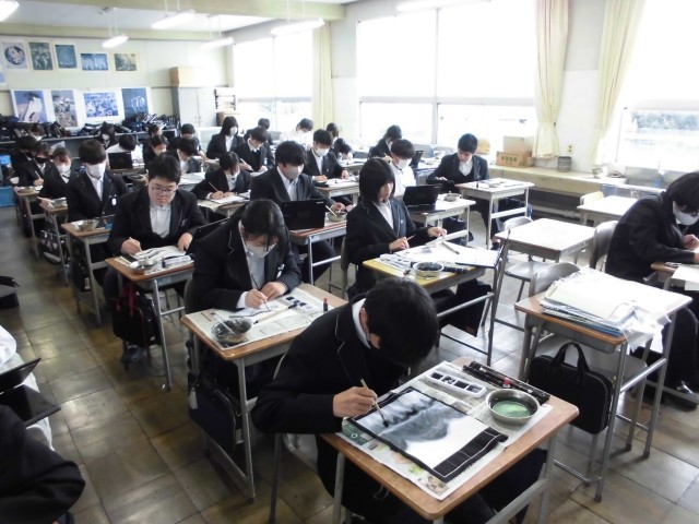 3枚目は2年生「美術」の様子です。水墨画の制作をしています。濃淡を工夫しながら、丁寧に作品づくりに取り組んでいました。