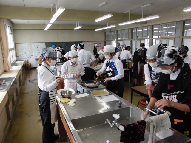 4枚目は1年生「家庭科」の様子です。調理実習に取り組んでいます。声を掛け合ったり、作業を協力して行ったりしながら、生姜焼きの調理をしていました。