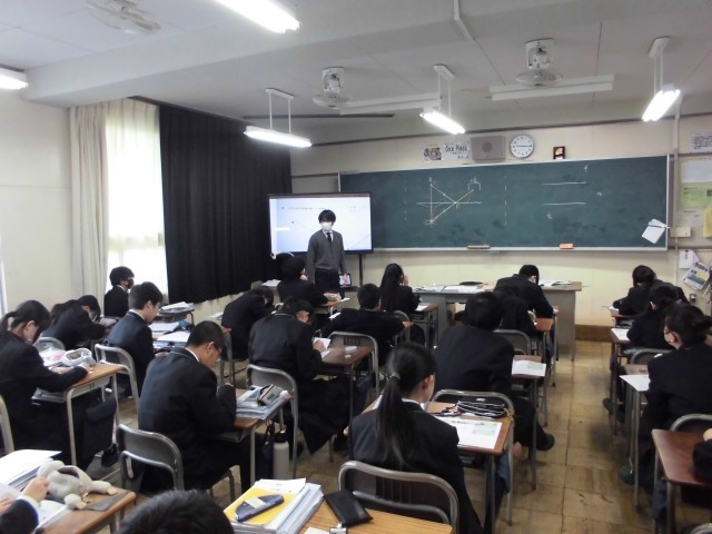 4枚目は1年生「数学」の様子です。移動と作図の利用について学習をしています。「羊を放牧場から出して、川で水を飲ませてから小屋へ帰ります。道のりを最も短くするためにはどのコースを通ればよいか?」という問題を考えていました。これまでの学習を思い出しながら、集中して学習に取り組んでいました。
