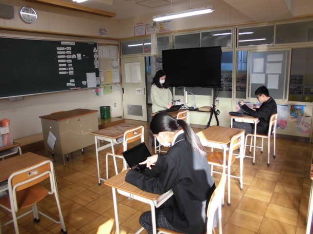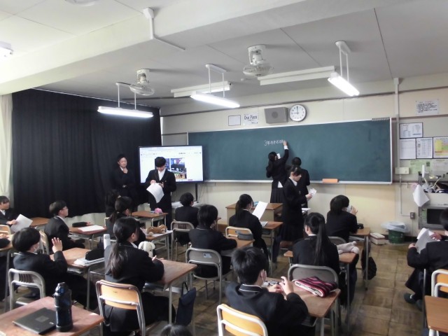 1枚目は1年生「総合」の様子です。卒業生を送る会に向けて活動をしています。今日は1年生がどんなことを行うのかの説明が中心でした。生徒たちが中心となって声を掛け合いながら進める姿に成長を感じました。