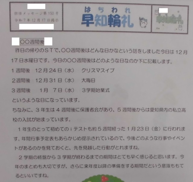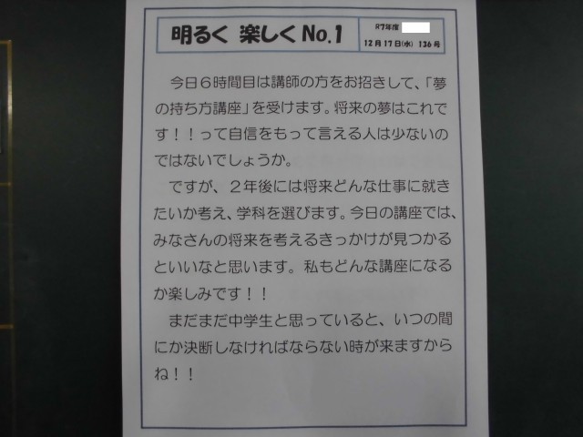 1年生は、今日の6時間目に、講師の方をお迎えして「夢の持ち方講座」を開催します。