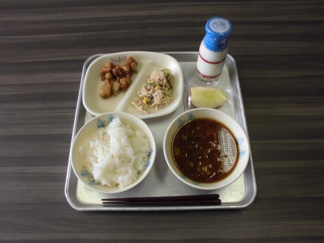 ご飯 牛乳 たらのゆずだれがらめ 冬至のみそ汁 シャキシャキ和え りんご