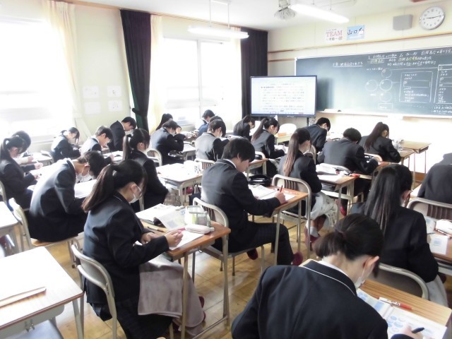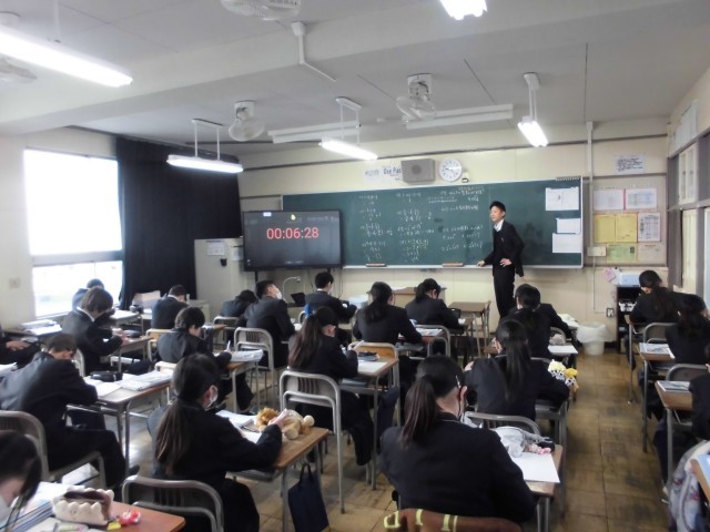 4枚目は1年生「数学」の様子です。これまでの学習の復習をしていました。「自然数」と「整数」についての復習の場面では、先生と対話をしながら確認をしていました。意欲的に学習に取り組む姿が多く見られ、すばらしかったです。