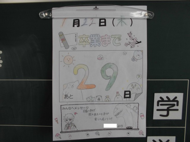 3年生の教室に、卒業までのカウントダウンカレンダーが掲示されました。
