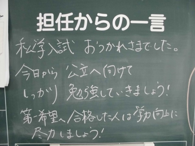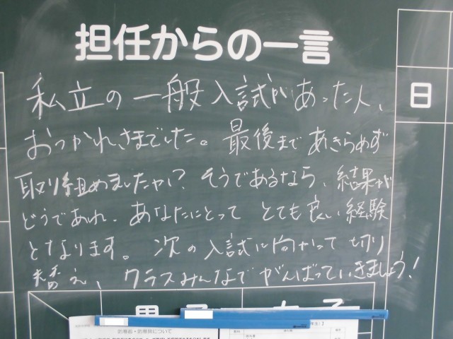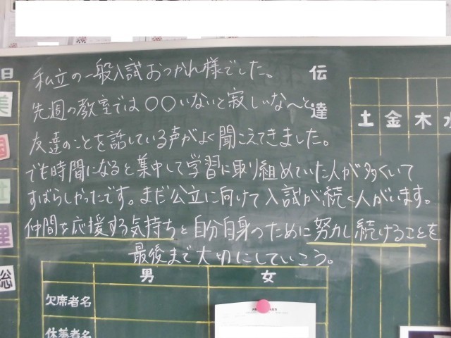 3年生は先週、愛知県私立・専修学校の一般入試が行われました。「力を高める取り組みの継続」「切り替える」「仲間を大切に」、どれも大切なことですね。体調管理に心がけながら、一歩一歩進んでいきましょう。