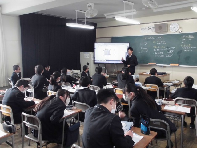 4枚目は1年生「数学」の様子です。二直線の位置関係について学習しています。ねじれの位置について周りの子と自分の考えを交流していました。