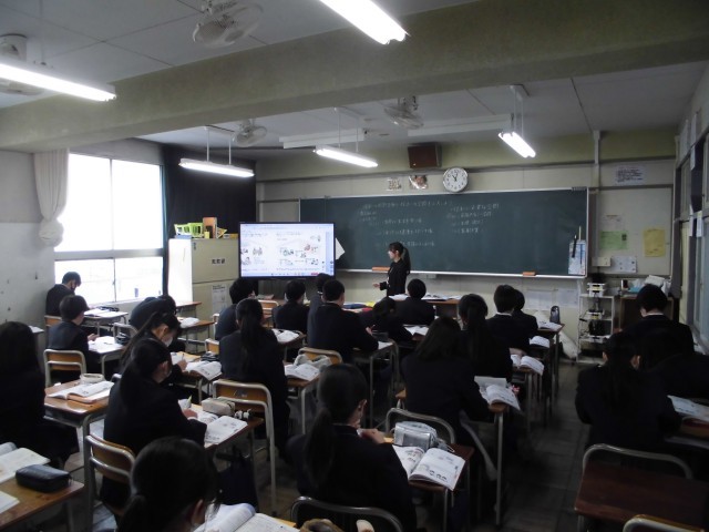 3枚目は3年生「理科」の様子です。「生物濃縮」について学習しています。写真は動画を視聴しているところです。その後、先生と環境の問題について話し合いをしていました。