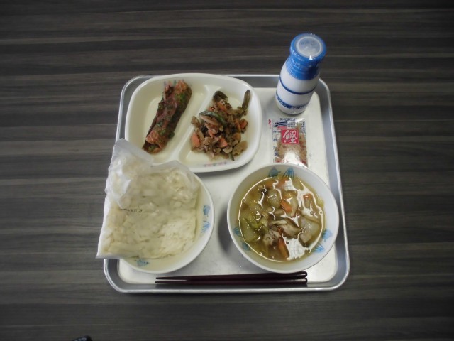 きしめん 牛乳 五目きしめん(汁) かつお節 ちくわの米粉磯部揚げ きんぴられんこん