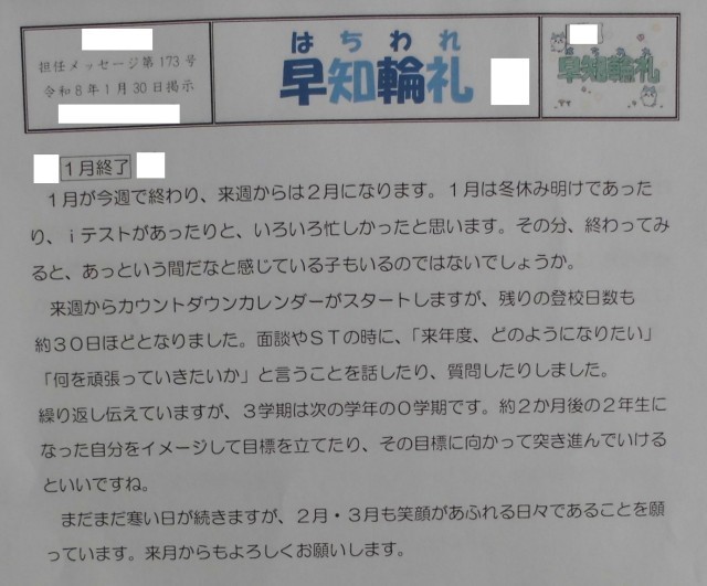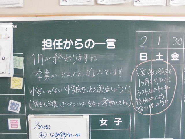 今日は1月最後の登校日です。卒業・進学・進級が近づいてきました。1日1日を大切に過ごしていきましょう。