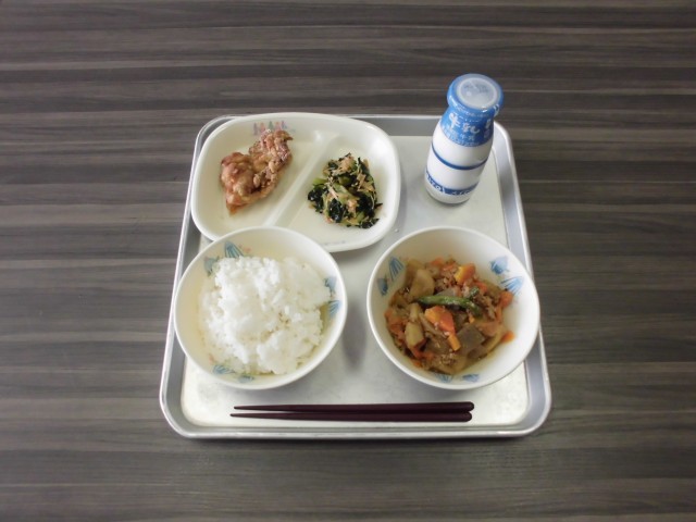 ご飯 牛乳 とり肉の竜田揚げ 大根のそぼろ煮 小松菜のなめたけ和え