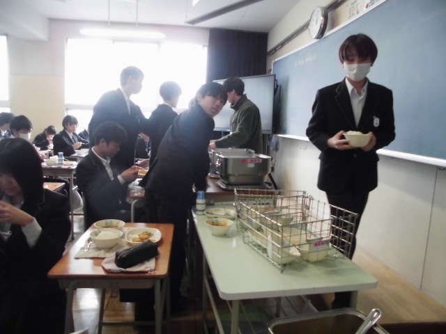 中学2年生の教室では「大盛にしてほしい!」とご飯の周りに生徒が集まるにぎやかな光景が見られました。今朝は冷え込みが厳しかったものの、カレーに含まれるスパイスの効果で血流を促し、体の内側から温まったようです。スパイスの力で免疫力を高め、感染症に負けない丈夫な体を作っていきましょう。
