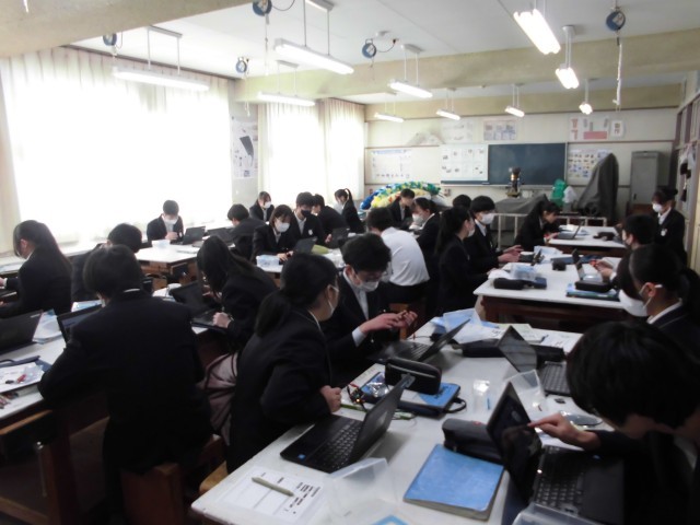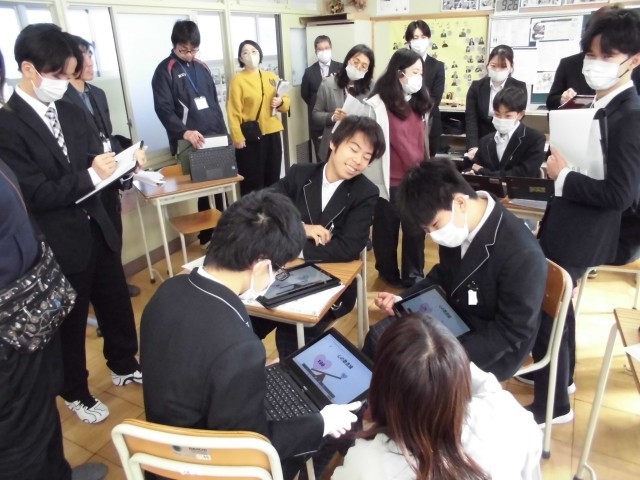 3枚目は3年生「技術」の様子です。プログラミングの学習をしています。音楽を打ち込んで音を出したり、文字を表示させたり、意欲的に活動していました。