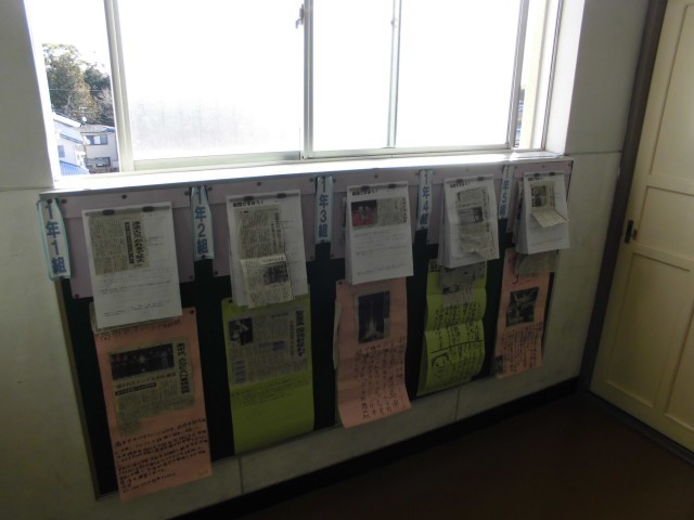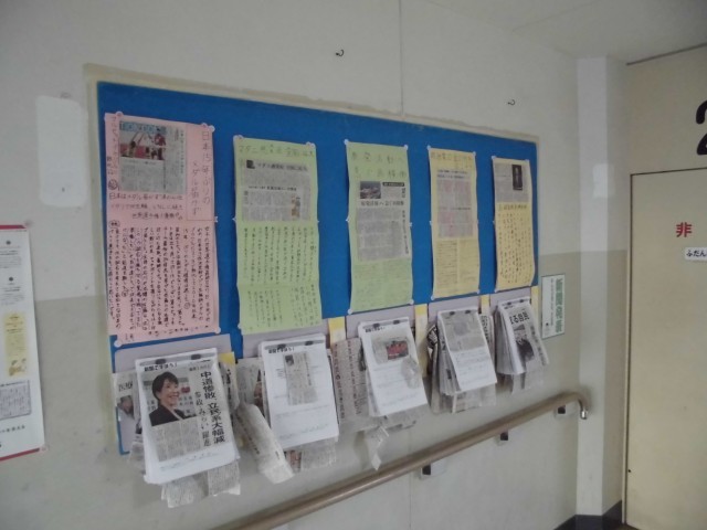 気になる新聞記事を紹介する活動を継続して行っています。 掲示物を見ると、「衆議院議員選挙」と「冬季オリンピック」についての紹介が多く見られます。