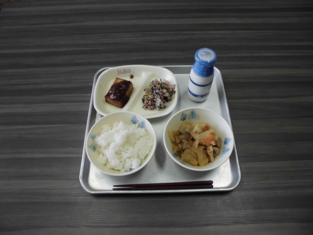 ご飯 牛乳 絹厚揚げの肉みそがけ 関東煮 赤じそ和え