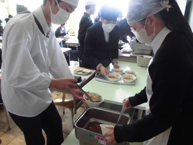 2年生の学級では給食当番が正しい服装で、声を掛け合いながら丁寧に配膳する姿がありました。当番は、調理員から受け取った「給食のリレーの大事なアンカー」です。「ぶりのタレも入れよう」「汁はぴったりだった」という声も聞こえ、真剣に責任を果たそうとする姿勢が伝わってきました。