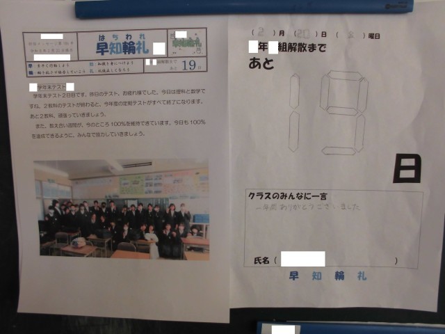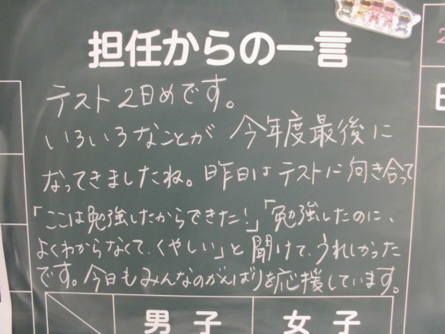 学年末テスト2日目です。最後までやり切りましょう。応援しています。