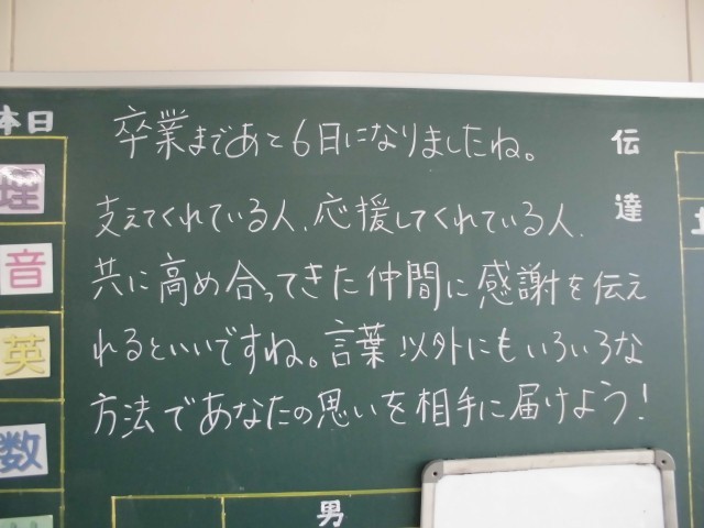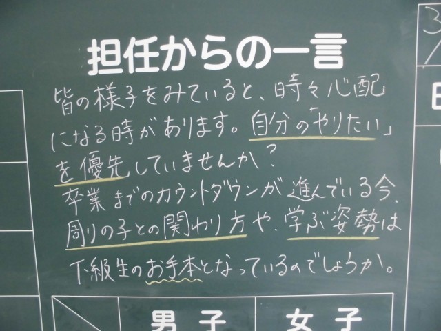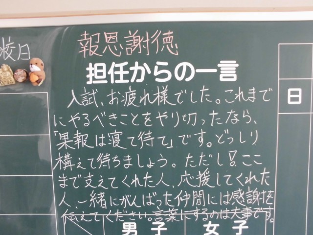 昨日受検をした3年生のみなさん。お疲れ様でした。卒業に向けて、心と体を整えていきましょう。