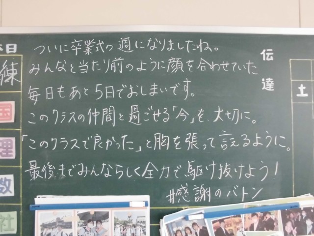 3年生にとって、浅井中学校での生活は残り5日です。1日1日を大切に過ごしましょう。
