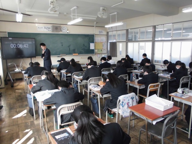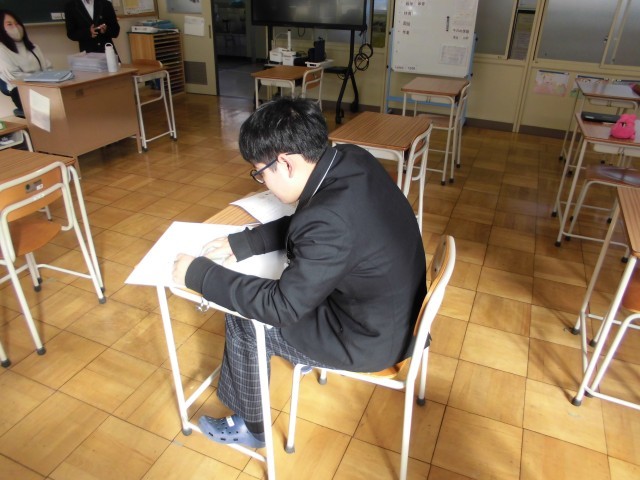3枚目は1年生「数学」の様子です。1年生で学習した内容の復習問題に取り組んでいます。クラスに入ると素晴らしい姿勢の生徒が目に入りました。実は、昨日教室に行ったときもいい姿勢だったので、「素晴らしい姿勢だね」と声を掛けました。その生徒は嬉しそうに小さくうなずきました。学習プリントを見ると、一生懸命取り組んだことが伝わってきました。「やる気は姿勢からも伝わってくる」こんなことを再確認しました。