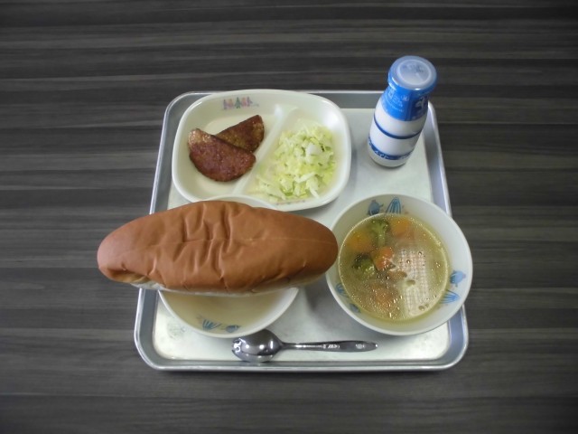 サンドイッチロールパン 牛乳 ハムカツサンドの具(ハムカツ・キャベツのドレッシング和え) コンソメスープ