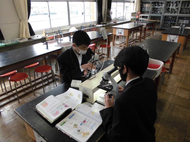 1枚目は特別支援学級「理科」の様子です。顕微鏡を使って、細胞の観察をしています。プレパラートのセットの仕方、ピントの合わせ方など、顕微鏡を正しく使って観察をすることができていました。
