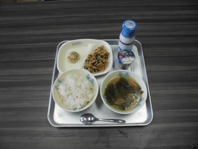 麦ごはん 牛乳 ビビンバの具 にらまんじゅう わかめスープ ヨーグルト