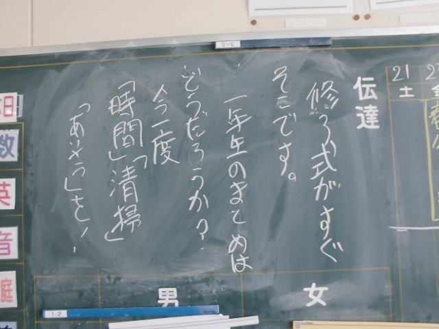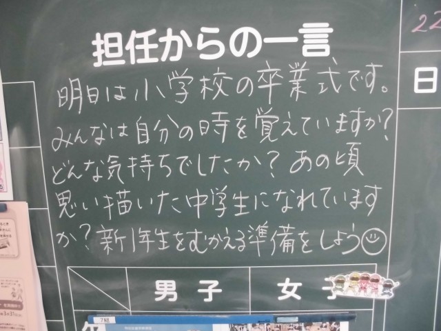 明日は小学校の卒業式です。来年度浅井中に入学してくる子たちの節目の日です。きっと、もの・心の準備を進めていることだと思います。